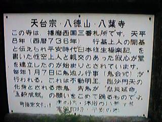 ( 6mountain in Harima district ). This temple is dedicated to the Kanzeonbosatsu. People who live in Kodera town and various places believe in this temple. This bosatsu was made by Gyoki in 736 ( Tenpyou era ). It is said that there was budda coming from India in this bosatsu. The Festival of Hachiyou-temple which called Onieshiki is held on January 7th. ( by Yukiko Ohno ) ( photo by Jun Hashimoto ) | |