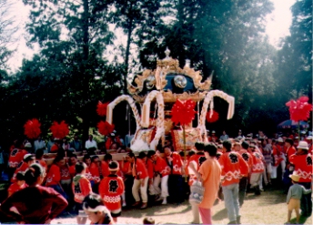 There are many Autumn festival in our Kodera town. Usually I go to Hirota-Shrine in Mizoguchi : and eat a lunch on festival second day. There is a Mochimaki, people throw red and white mochi ( rice cake ) from the sacred. It is interesting for me. We do sumo wrestling and enjoy it. Another interesting thing is to look the Mikosi lifting up more than usual. ( by Tomoyo Sugahara ) |