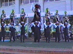 Traditional dance of Shishi in Inukai The biginning of this dance is to wish good harvest. This is held on October 10th every year. ( by Kazuko Utsumi ) (This photo is from videotape of Hiromichi's father.) |