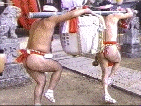 and made itself banks to prevent washed away. People offered the big barrel which is full of sake to express their thanks. Then good harvest have continued. People visit the shrine carrying the sake barrel to express their thanks for good harvest to god. This is the origin of this event. Men wearing "Fundoshi" visit the shrine saying "Isshi Isshi Dokkoi". And then they walk around the shrine singing a song. ( by Hitoshi Yasusaka ) ( This photo is from video tape of Hiromichi's father ) |