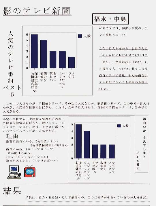 5年生は気象衛星ひまわりの画像を取り込んで、明日の天気を予想したり、近隣の学校にアンケートをパソコン通信で送ってもらい新聞づくりなどをしました